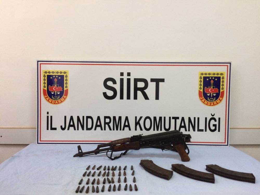 Siirt Valiliğinden yapılan açıklamada, "Siirt İli Merkez İlçesinde kullanılmayan metruk yapılarda yapılan kontroller sırasında A.E. isimli şahsa ait uzun zamandır kullanılmayan iki katlı evde yapılan aramada, bir adet Kaleşnikof Piyade Tüfeği, 3 adet Kaleşnikof Piyade Tüfeğine ait şarjör, 42 adet Kaleşnikof Piyade Tüfeğine ait fişek ele geçirildi.