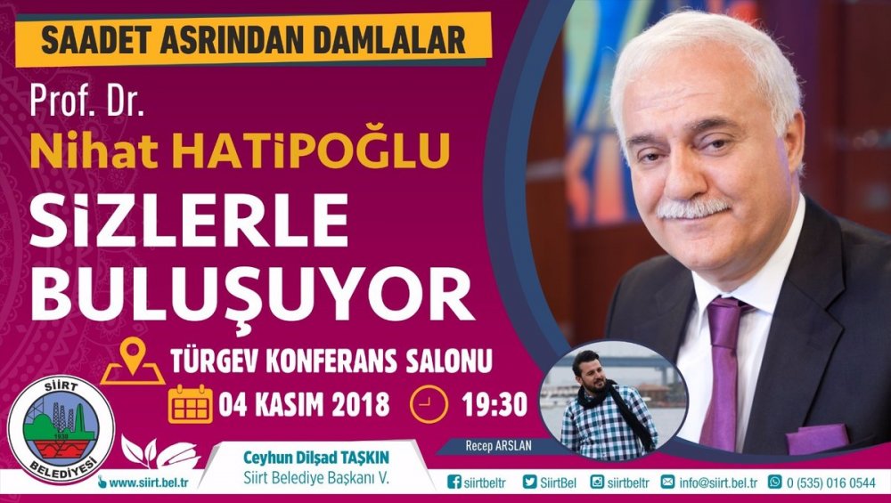 Birçok televizyon ve radyoda programları olan ünlü İlahiyatçı Prof. Dr. Nihat Hatipoğlu, Siirt Belediyesinin konuğu olarak Siirt’e gelerek ‘Saadet Asrından Damlalar' konulu konferans verecek. Türgev Konferans salonunda düzenlenecek olan program Kur’an-ı Kerim Tilaveti ile başlayacak. Recep Arslan’ın seslendireceği ilahi dinletileri ile devam edecek program Prof. Dr. Nihat Hatipoğlu’nun “Saadet Asrından Damlalar” söyleşisi ile sona erecek.
