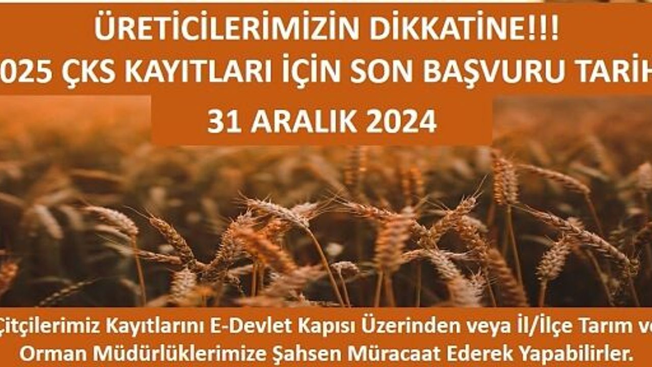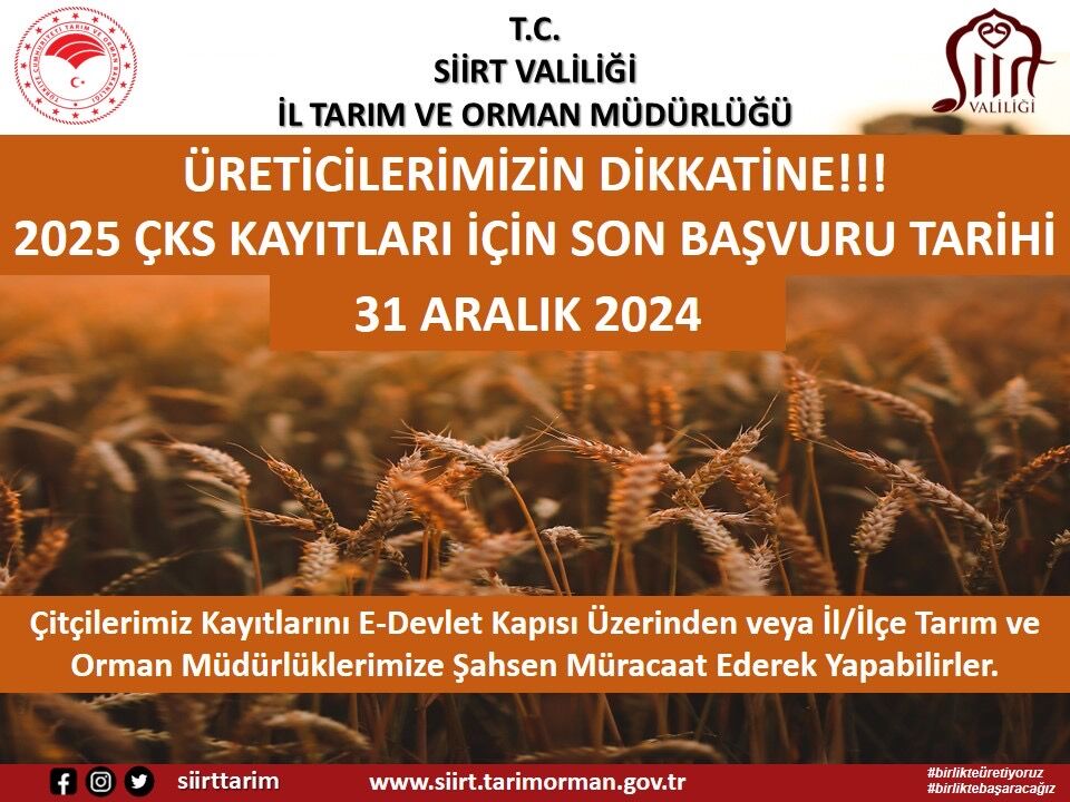 2025 üretim yılı için Çiftçi Kayıt Sistemi (ÇKS) başvuruları devam ediyor. Çiftçilerimiz, 31 Aralık 2024 tarihine kadar ÇKS kayıtlarını e-Devlet Kapısı üzerinden kolaylıkla yapabilecekleri gibi, Siirt İl veya İlçe Tarım ve Orman Müdürlüklerine şahsen başvurarak da işlemlerini tamamlayabilirler.