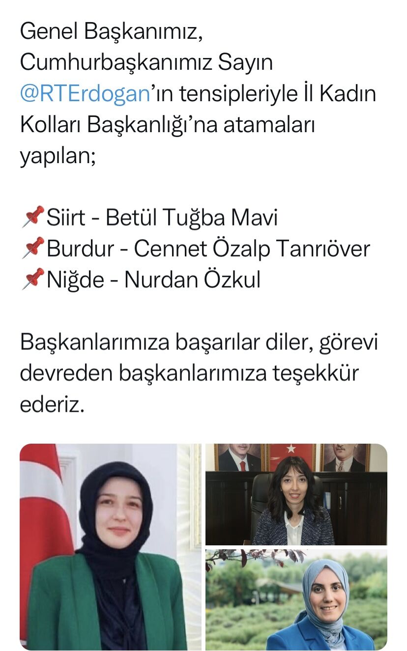 AK Parti Kadın Kolları Genel Merkezi sosyal medya hesaplarından yapılan açıklamada, Siirt AK Parti Kadın Kolları Başkanlığına Sİirt Yeşilay Başkan Yardımcılığı görevini yürüten Av. Betül Tuğba Mavi'nin atandığı duyuruldu.