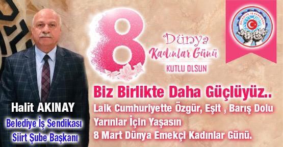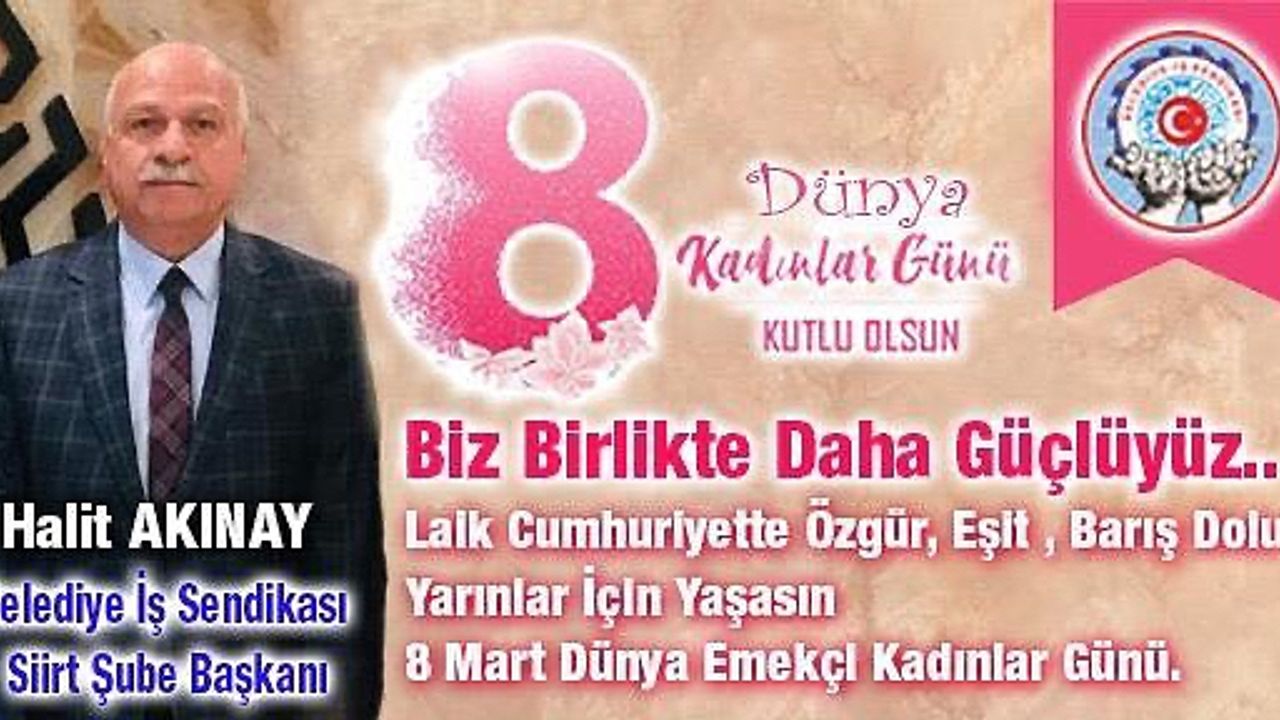 Belediye İş Sendikası Siirt Şube Başkanı Halit Akınay, 8 Mart Dünya Kadınlar Günü dolayısıyla bir mesaj yayımladı.