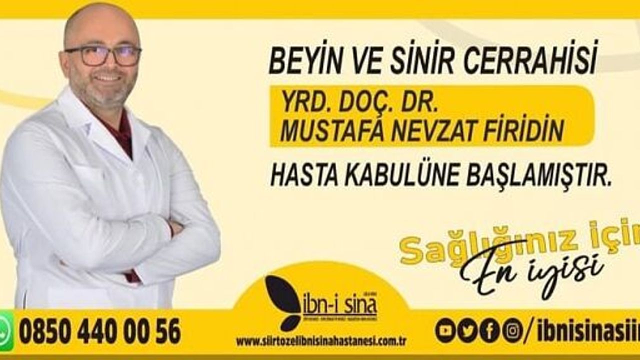Siirt Eğitim ve Araştırma hastanesinden istifa eden başarılı Doktor Beyin ve Sinir Cerrahi Uzmanı Yrd. Doç. Dr. Mustafa Nevzat Firidin Özel Siirt İbni Sina Hastanesinde hasta kabülüne başladı.