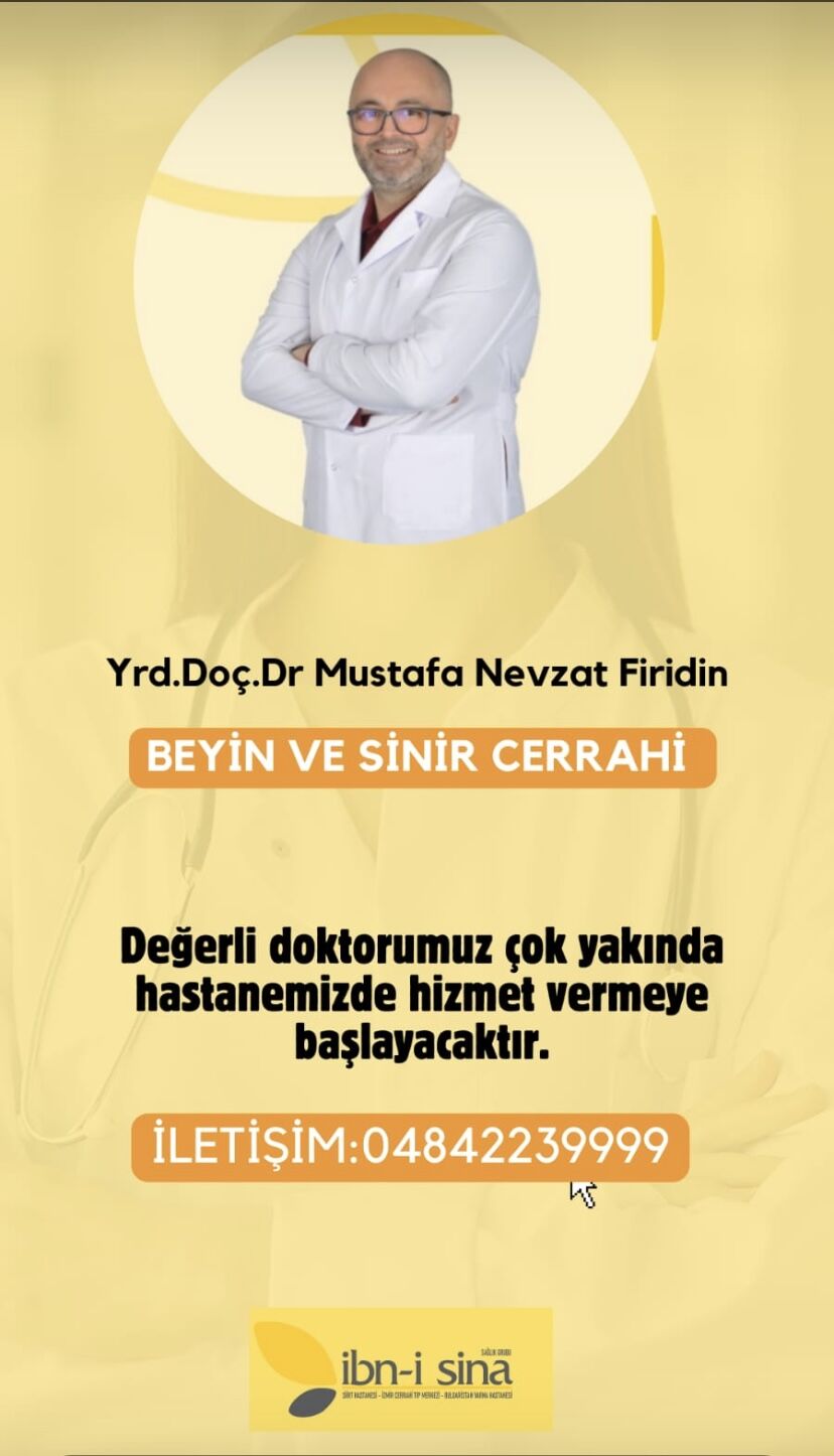 Yrd. Doç. Dr. Mustafa Nevzat Firidin'nin mikro cerrahi ile bel ve boyun fitığı ameliyatları, lazer ile kamerali kapali sistem bel fitığı ameliyatları, bel daralmasi, omurilik sikışmasi ameliyatlarıi, bel, sirt, boyun omurga kirıkları ameliyatlari, beyin kanaması ameliyatları, beyin, beyincik ve omurilik tümörleri tedavileri ilgi alanlar olduğu öğrenildi.
