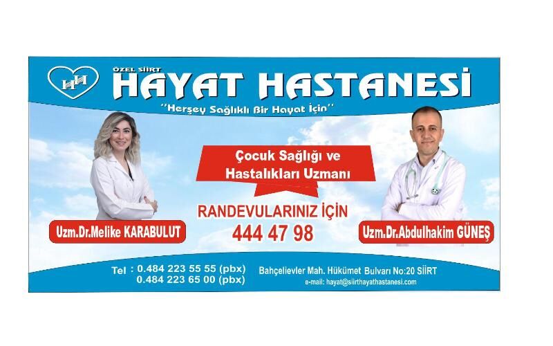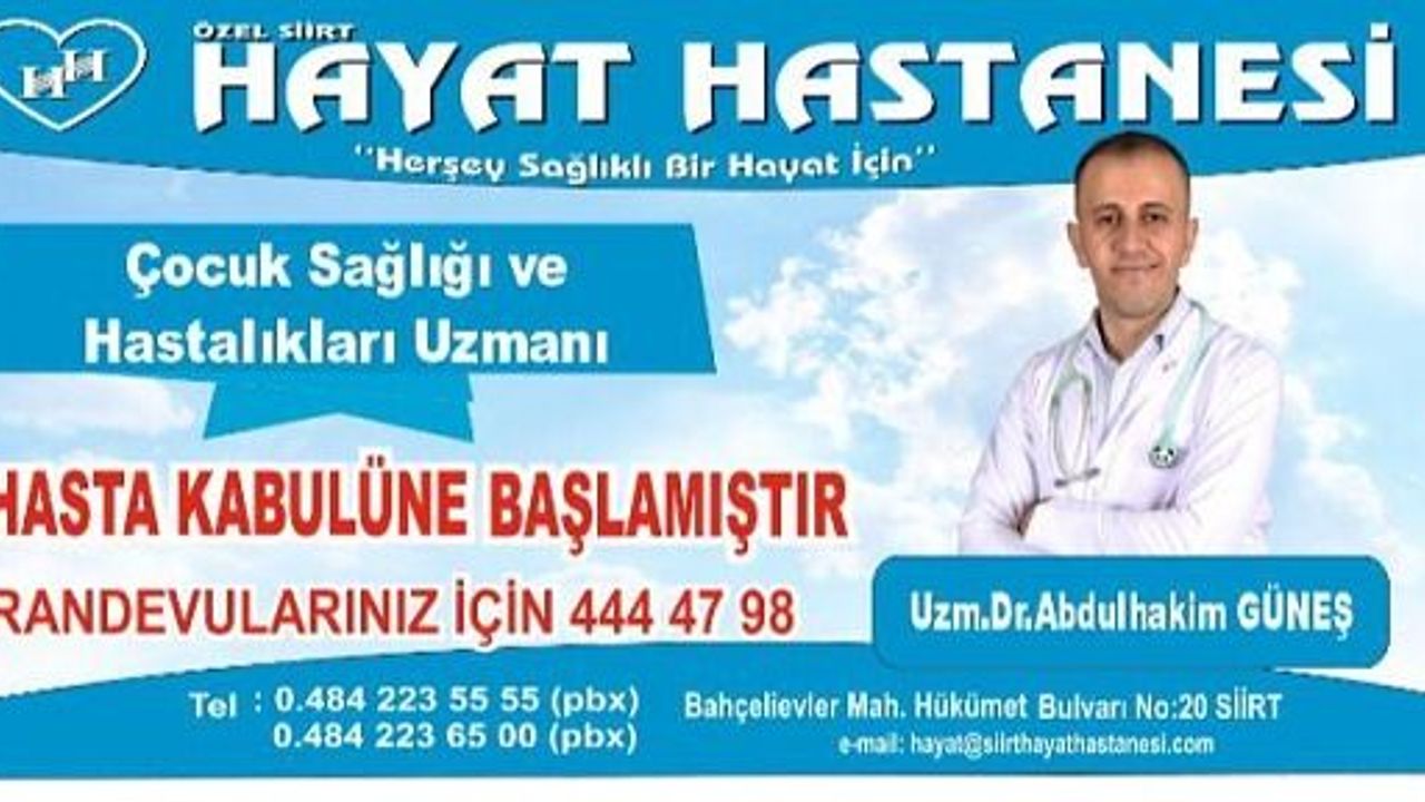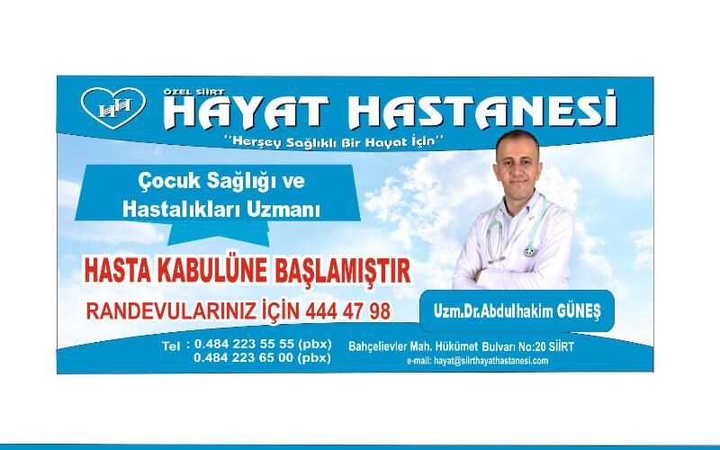 Özel Siirt Hayat Hastanesi Müdürü Necmettin Fırat yaptığı açıklamada; "Çocuk Sağlığı ve Hastalıkları Uzmanı Dr. Melike Karabulut’tan sonra Bursa Uludağ Üniversitesi Tıp Fakültesi Mezunu Çocuk Sağlığı ve Hastalıkları Uzmanı Dr. Abdulhakim Güneş’i kadrolarına kattıklarını belirterek, çocuklarımızın her türlü tedavisi polikliniklerimizde ve çocuk servisimizde yapılarak Özel Siirt Hayat Hastanesi olarak Siirt halkına en iyi sağlık hizmetini vermeye çalışacaklarını söyledi."