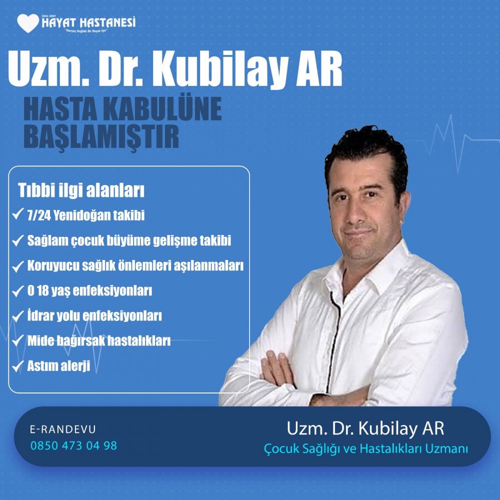 Özel Siirt Hayat Hastanesi’nde çocuk sağlığı hizmetlerinden yararlanmak isteyen aileler, randevu alarak Dr. Kubilay Ar’a başvurabilir.
