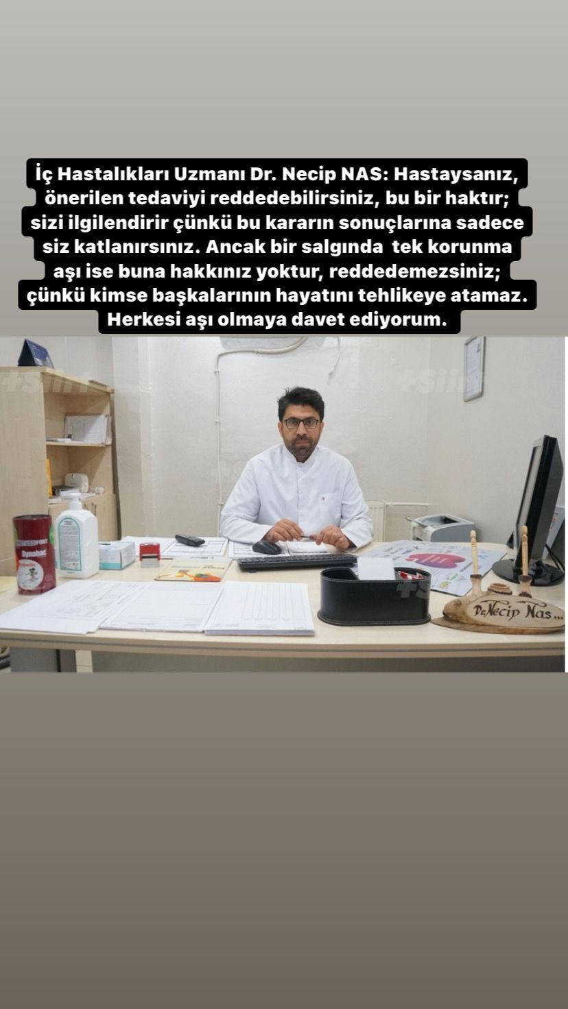 Özel Siirt Hayat Hastanesi İç Hastalıkları Uzmanı (Dahiliye) Doktoru Necip Nas yaptığı açıklamada; hastaysanız önerilen tedaviyi reddedebilirsiniz, bu bir haktır; sizi ilgilendirir çünkü bu kararın sonuçlarına sadece siz katlanırsınız. Ancak bir salgında tek korunma aşı ise buna hakkınız yoktur, reddedemezsiniz; çünkü kimse başkalarının hayatını tehlikeye atamaz. Herkesi aşı olmaya davet ediyorum ifadelerini kullandı.