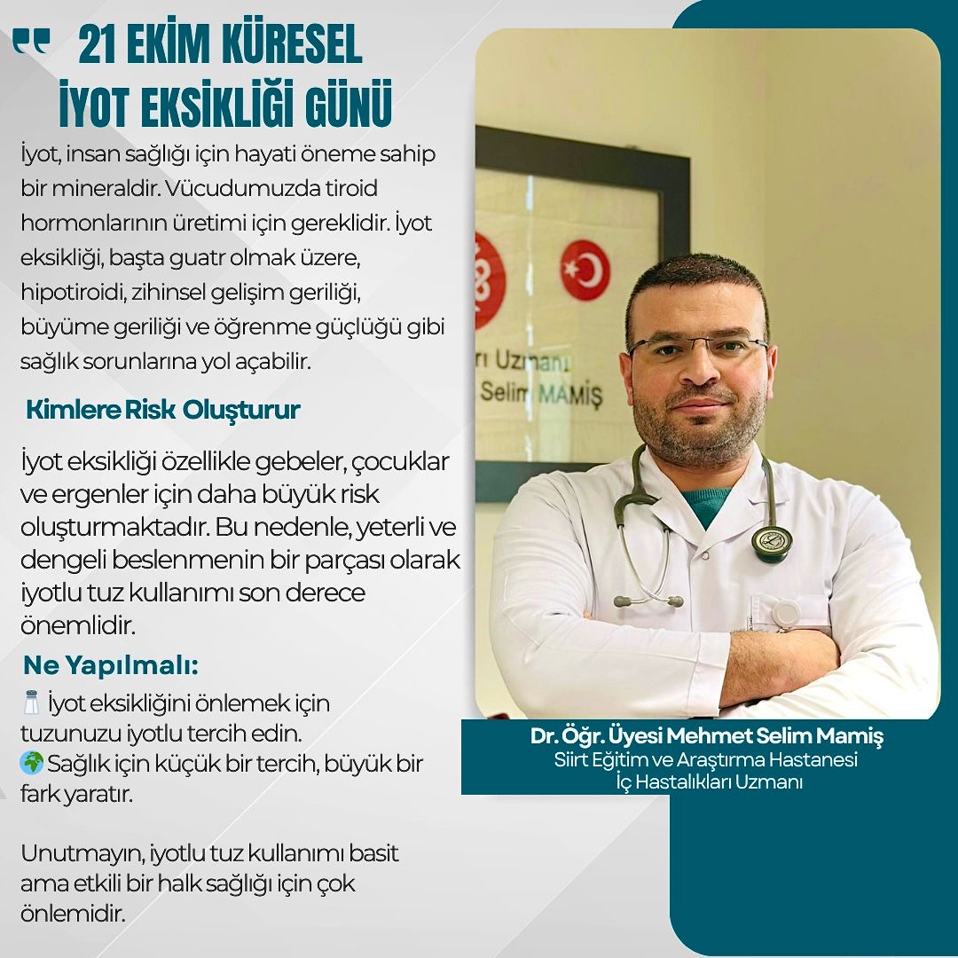 Dr. Mamiş, “İyot, vücudumuzda tiroid hormonlarının üretimi için gereklidir. İyot eksikliği; guatr, hipotiroidi, zihinsel gelişim geriliği, büyüme geriliği ve öğrenme güçlüğü gibi birçok sağlık sorununa yol açabilir.” dedi.