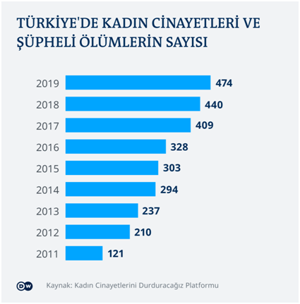 Kadın hakları platformlarının verdiği bilgiye göre, Türkiye'de her gün neredeyse bir kadın öldürülüyor. “Kadın Cinayetlerini Durduracağız Platformu” nun yayınladığı istatistiklere göre her yıl cinayete kurban giden