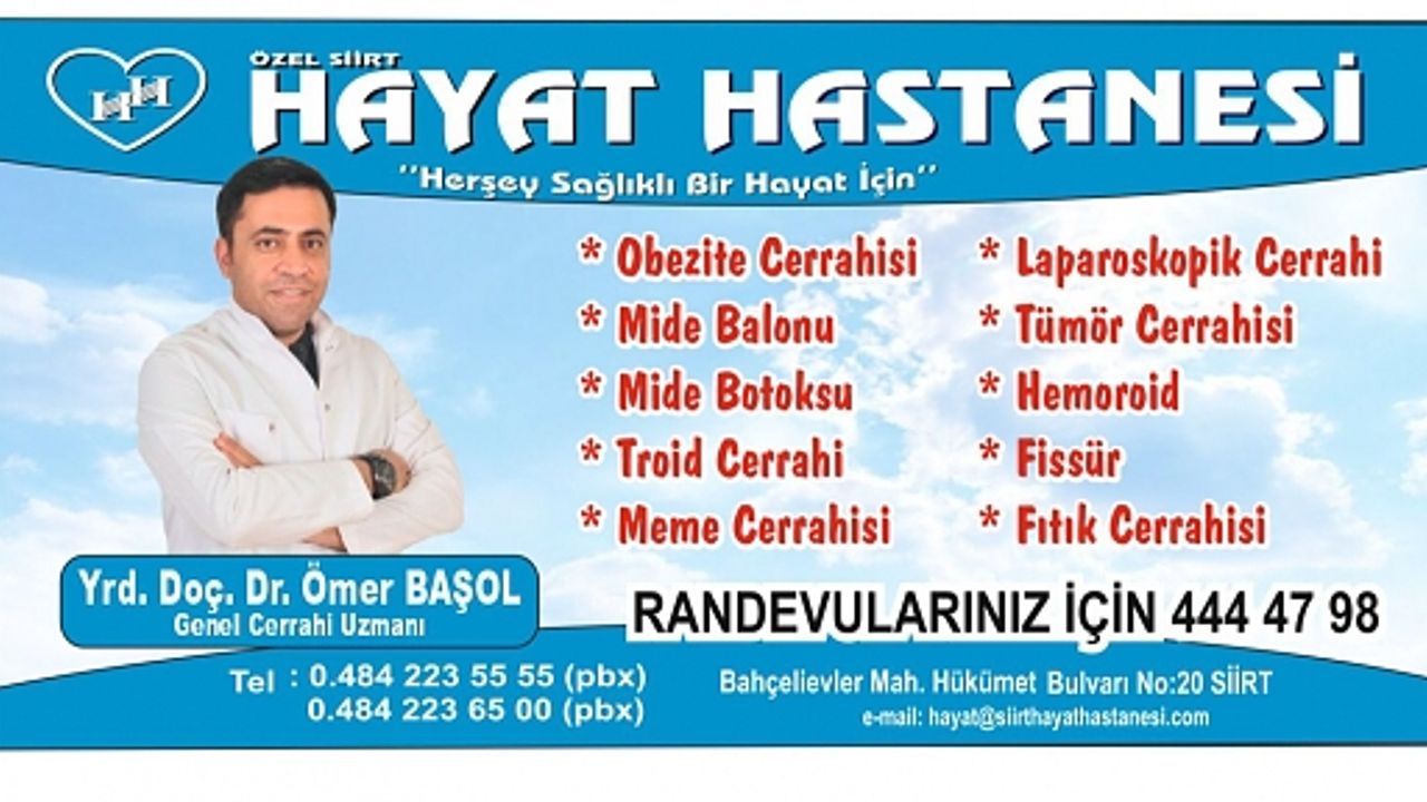 Özel Siirt Hayat Hastanesi Genel Cerrahi Uzmanı Yrd. Doç. Dr. Ömer Başol tarafından, Minimal invaziv cerrahi (laparoskopi, endoskopik cerrahi), acil cerrahi, meme cerrahisi, endokrin cerrahisi (guatr, böbrek üstü bezi), sindirim sistemi cerrahisi, karaciğer, pankreas, safra yolları cerrahisinde öncü uygulamalarda bulunulmaktadır. Ayrıca Laparaskopik (kapalı) fıtık cerrahisi başarıyla uygulanmaktadır.