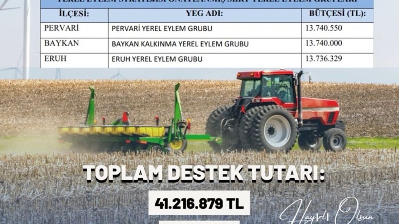 Bu kapsamda; Siirt ilimizde Pervari, Baykan ve Eruh ilçelerinde kurulan Yerel Eylem Grubu (YEG) Dernekleri tarafından hazırlanan yerel kalkınma stratejileri onaylanmış olup, söz konusu dernekler Tarım ve Kırsal Kalkınmayı Destekleme Kurumu (TKDK) ile sözleşme imzalamaya hak kazanmıştır.