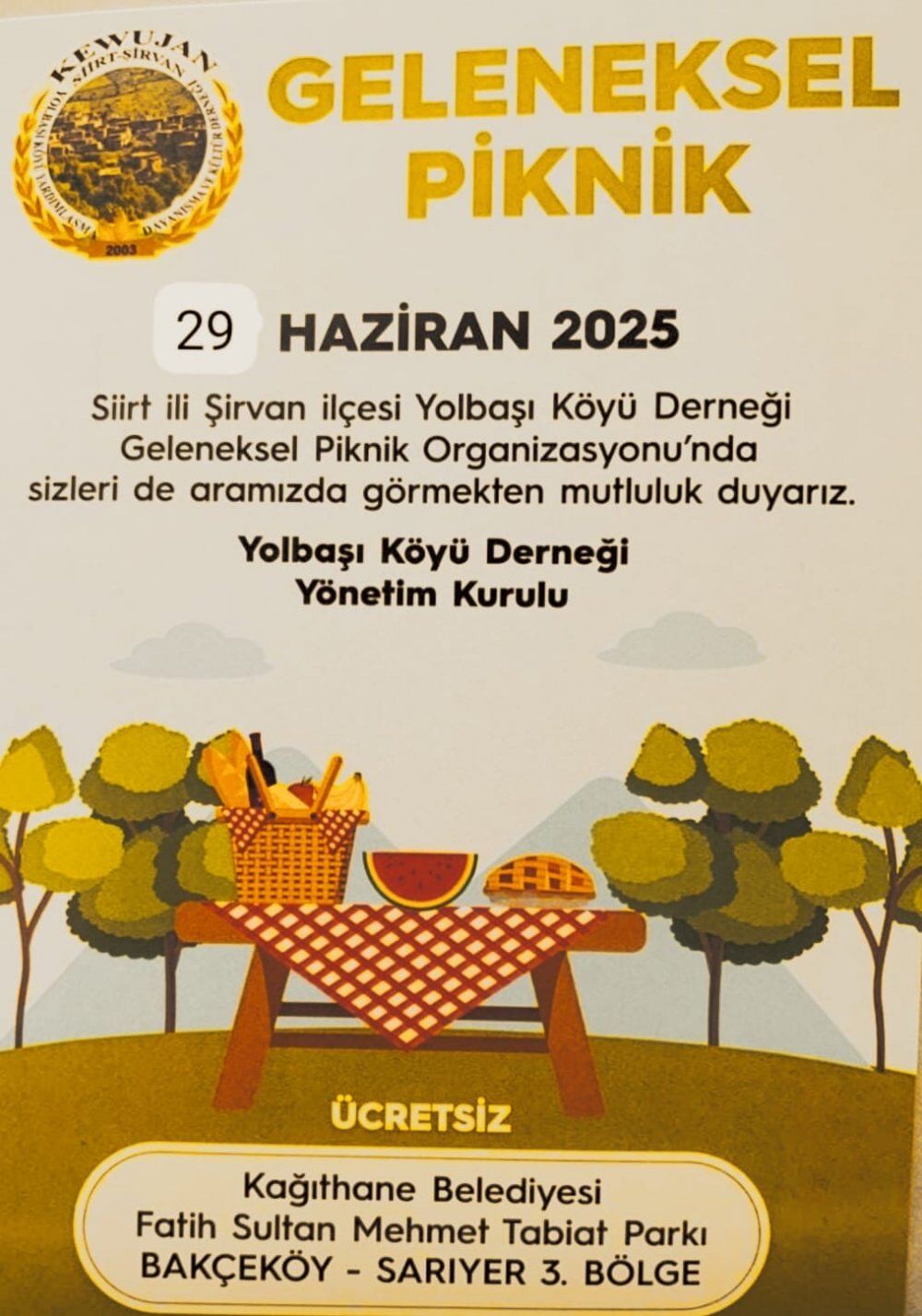 İstanbul’da faaliyetlerini sürdüren Siirt İli Şirvan İlçesi Yolbaşı Köyü Derneği, her yıl düzenlediği Geleneksel Piknik Organizasyonunu bu yıl da coşku ve dayanışma içinde gerçekleştirmeye hazırlanıyor.
