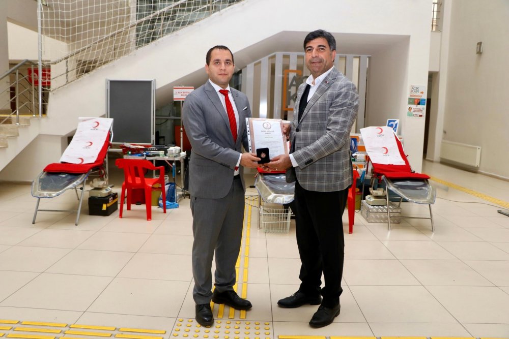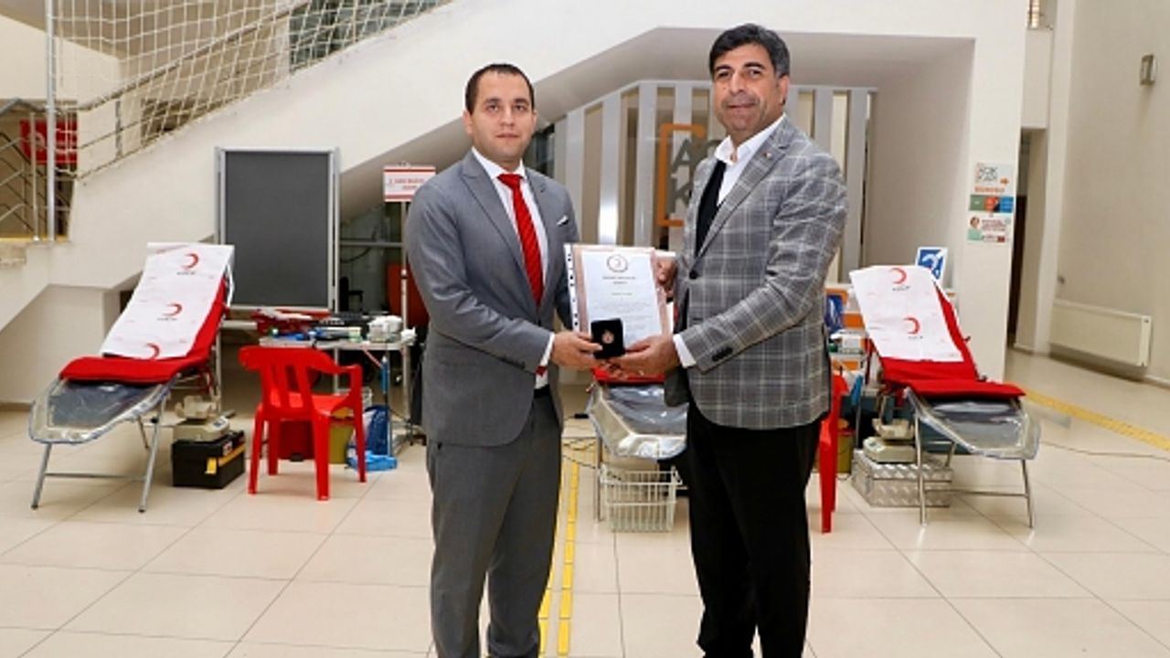 Siirt Valiliği giriş katında kurulan geçici kan bağışı merkezinde gerçekleşen törende, Kızılay Merkez Yönetim Kurulu Üyesi Yener Tanık, Vali Yardımcısı Tatlısöz’e bronz madalyayı takdim etti.