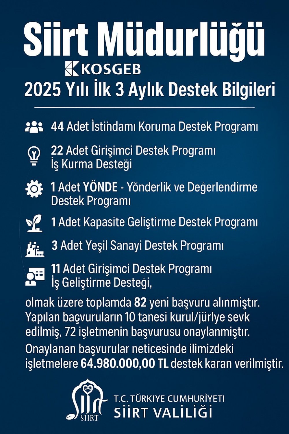Siirt Valiliği koordinasyonunda faaliyetlerini sürdüren KOSGEB Siirt İl Müdürlüğü, 2025 yılının ilk üç ayında işletmelere ve girişimcilere yönelik önemli desteklerde bulundu.