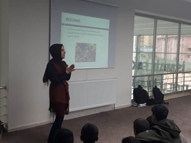Öğrencilerin yoğun ilgi gösterdiği seminerde konuşan Halkla ilişkiler Müdürü Belma Özturan amaçlarının çocukları günümüz hastalıklardan korumak için farkındalık oluşturmak olduğunu söyledi.