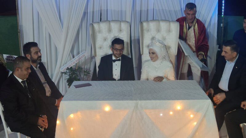 Nikâh töreninin ardından Siirt Valisi Belediye Başkan Vekili Osman Hacıbektaşoğlu, çifte mutluluk dileyerek aile cüzdanını gelin Merve Ayyıldız’a verdi.
