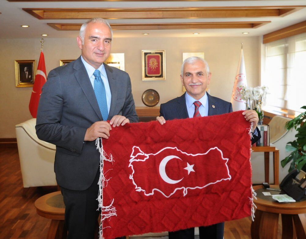 AK Parti Siirt Milletvekili Mervan Gül, Kültür ve Turizm Bakanı Mehmet Nuri Ersoy’a Siirt Battaniyesine işlenmiş Türk Bayrağı hediye etti.