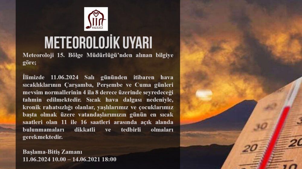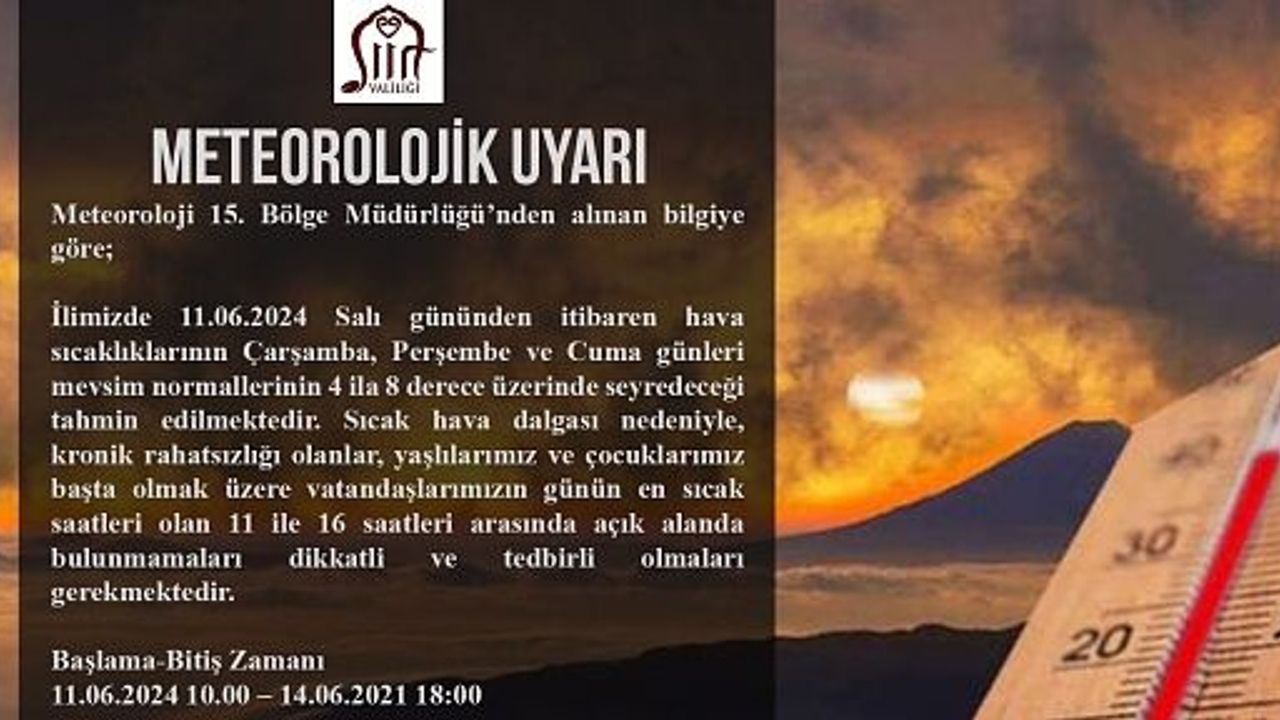 Sıcak hava dalgası nedeniyle, kronik rahatsızlığı olanlar, yaşlılarımız ve çocuklarımız başta olmak üzere vatandaşlarımızın günün en sıcak saatleri olan 11 ile 16 saatleri arasında açık alanda bulunmamaları dikkatli ve tedbirli olmaları gerekmektedir.