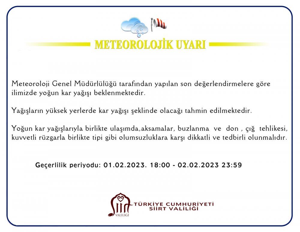 Meteoroloji Genel Müdürlüğü Siirt ve Batman illerinin yüksek kesimlerinde, gece saatlerinden sonra yoğun kar yağışı beklendiğini açıkladı.