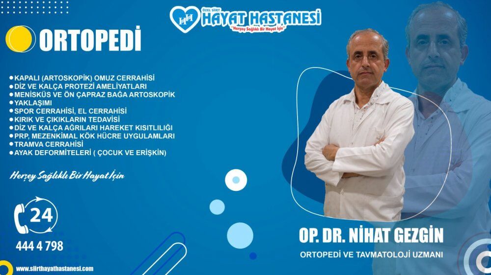 Özel Siirt Hayat Hastanesi Ortopedi ve Travmatoloji Uzmanı Dr.Nihat Gezgin tarafından diz protezi ve kalça protezi ameliyatları başarılı bir şekilde yapılıyor.