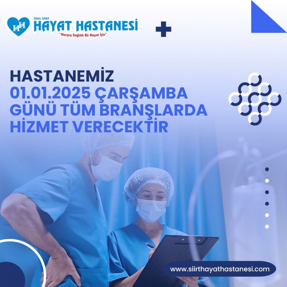 Özel Siirt Hayat Hastanesi, yeni yıl mesajıyla birlikte 1 Ocak 2025 Çarşamba günü itibarıyla tüm branşlarda poliklinik hizmeti sunacağını duyurdu.