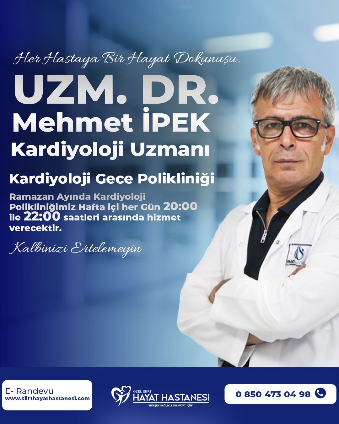 Pazartesi gününden itibaren başlayacak uygulama kapsamında, Kardiyoloji Uzmanı Dr. Mehmet İpek, Ramazan ayı süresince iftar sonrasında hastalarını kabul edecek.