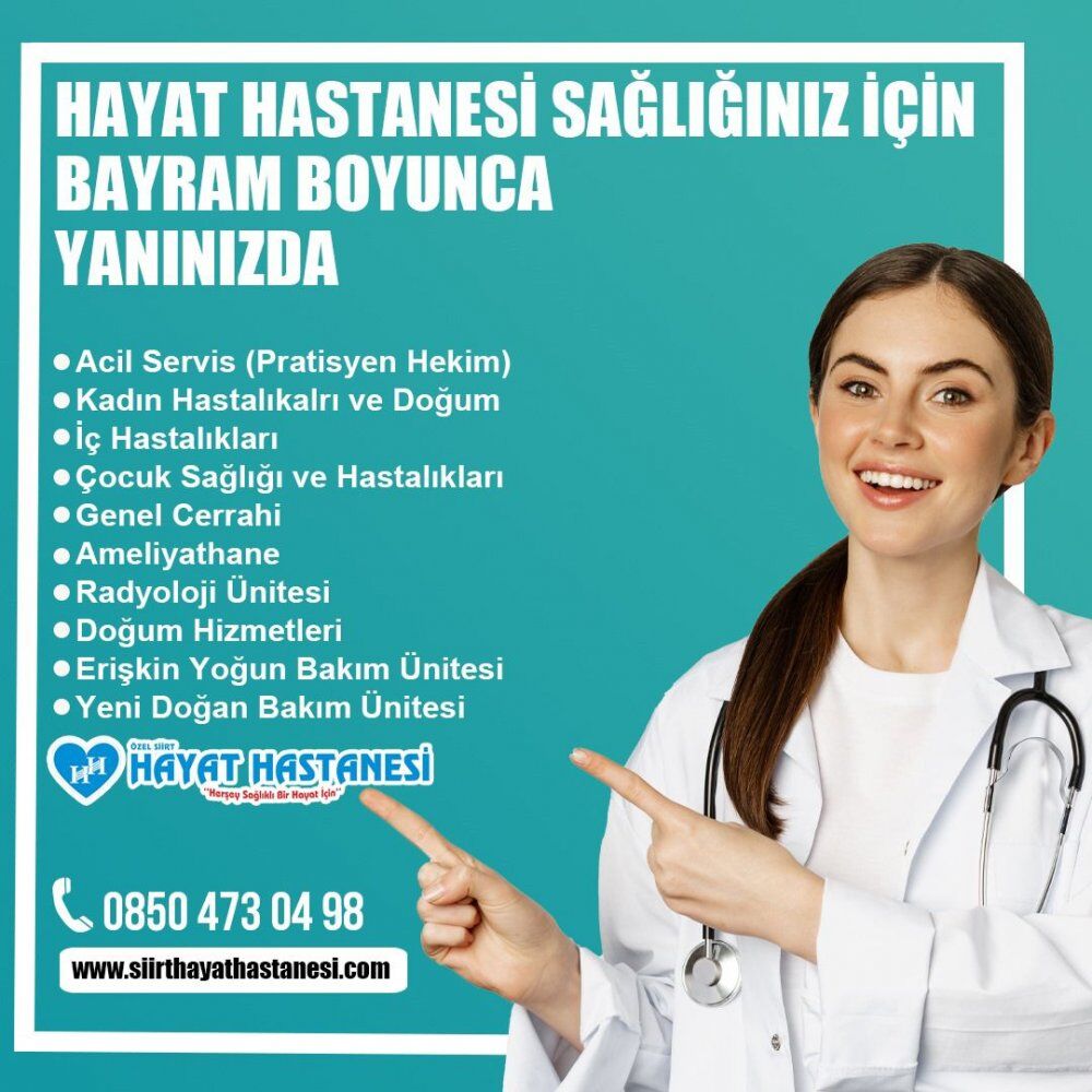 Kurban Bayramı boyunca acil durum, doğum, sezeryan ve acil muayeneler için Özel Siirt Hayat Hastanesinin Kadın Doğum, Dahiliye,Genel Cerfahi,Çocuk Hastalıkları ve acil servisin başarılı uzman doktorları hizmet vereceği öğrenildi.