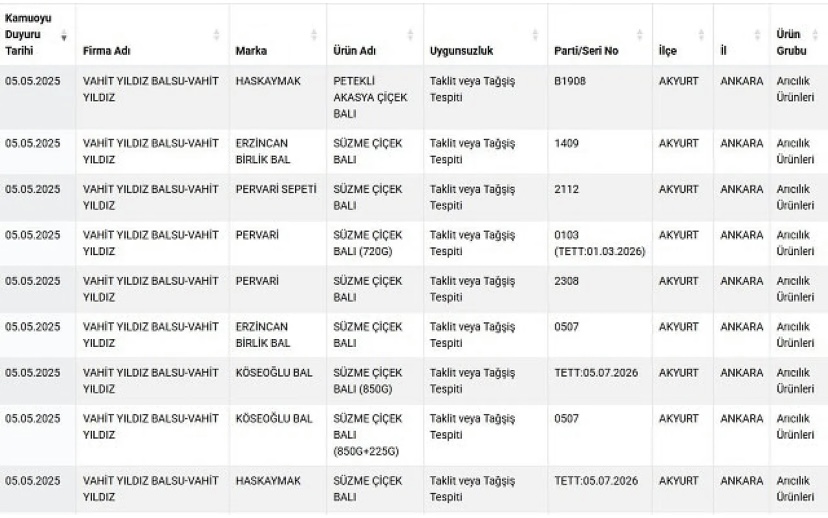 Bakanlık tarafından ifşa edilen hileli bal markaları şunlar: