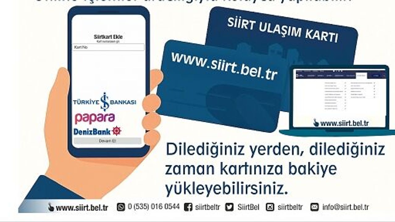 Siirt Belediyesi, vatandaşların ulaşım kartlarına bakiye yükleme işlemlerini daha hızlı ve pratik hale getirmek amacıyla yeni alternatifler sunuyor.