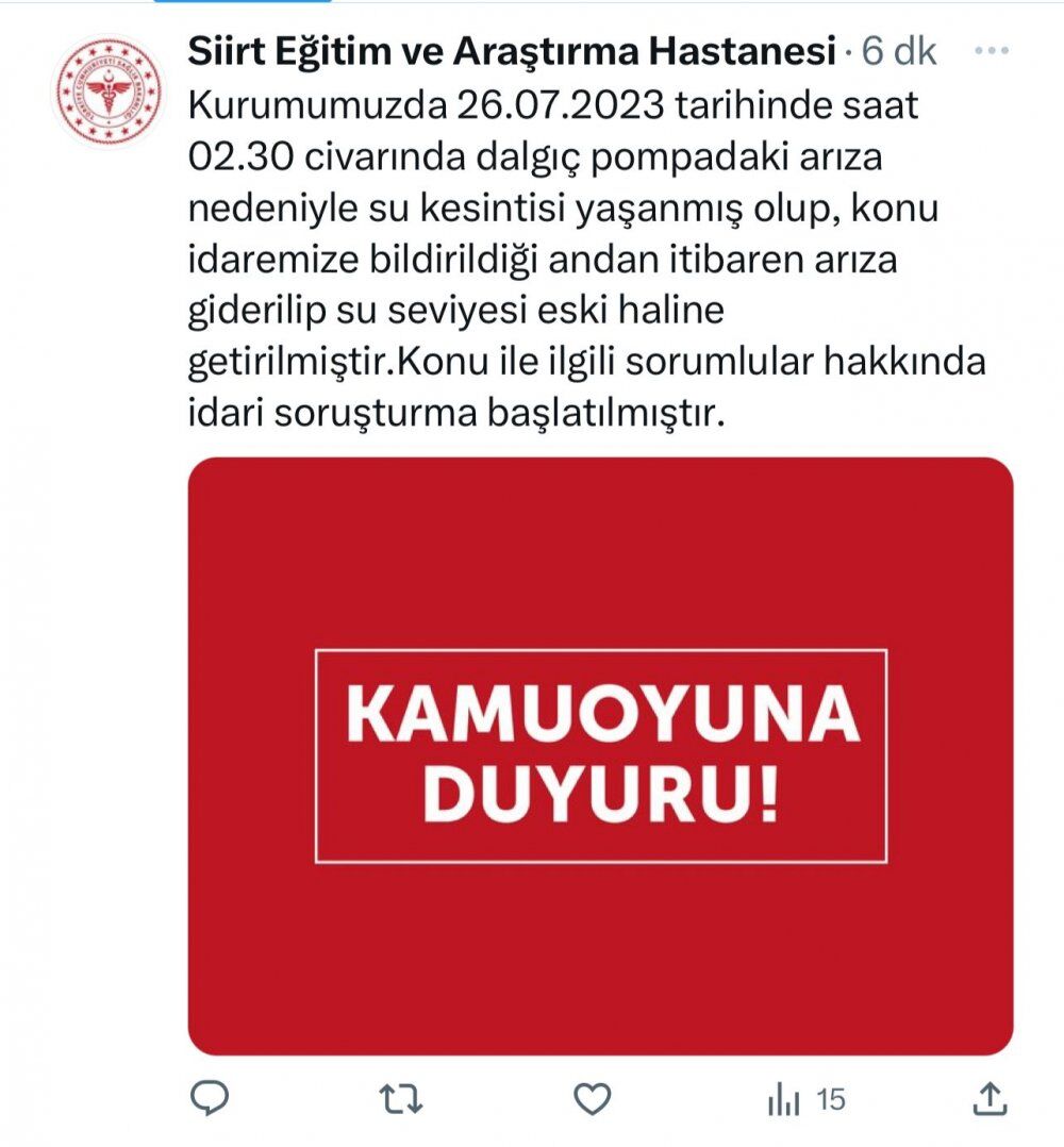 Siirt Eğitim ve Araştırma Hastanesi'nden yapılan yazılı açıklamada, şu ifadelere yer verildi: "Kurumumuzda 26.07.2023 tarihinde saat 02.30 civarında dalgıç pompadaki arıza nedeniyle su kesintisi yaşanmış olup, konu idaremize bildirildiği andan itibaren arıza giderilip su seviyesi eski haline getirilmiştir.Konu ile ilgili sorumlular hakkında idari soruşturma başlatılmıştır."