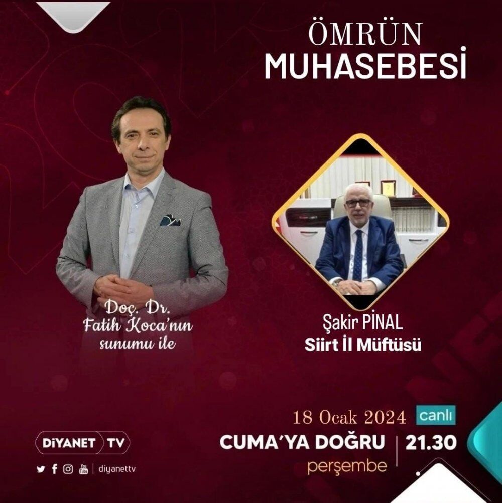 Siirt İl Müftüsü Şakir Pinal Perşembe akşam saat 21:30 Diyanet TV'de ömrün muhasebesi konusu ile mesajlarını anlatacak.