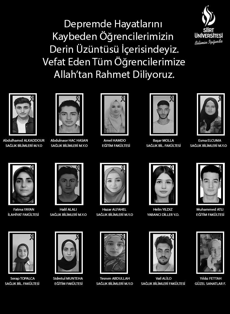 Siirt Üniversitesinden yapılan yazılı açıklamada; Depremde Hayatlarını Kaybeden Öğrencilerimizin Derin Üzüntüsü İçerisindeyiz.