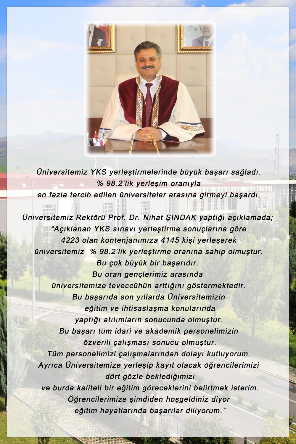 Siirt Üniversitesi Rektörü Prof. Dr. Nihat Şındak yaptığı açıklamada;"Açıklanan YKS sınavı yerleştirme sonuçlarına göre 4223 olan kontenjanımıza 4145 kişi yerleşerek, Siirt Üniversitemiz % 98.2'lik yerleştirme oranına sahip olmuştur.Bu çok büyük bir başarıdır.