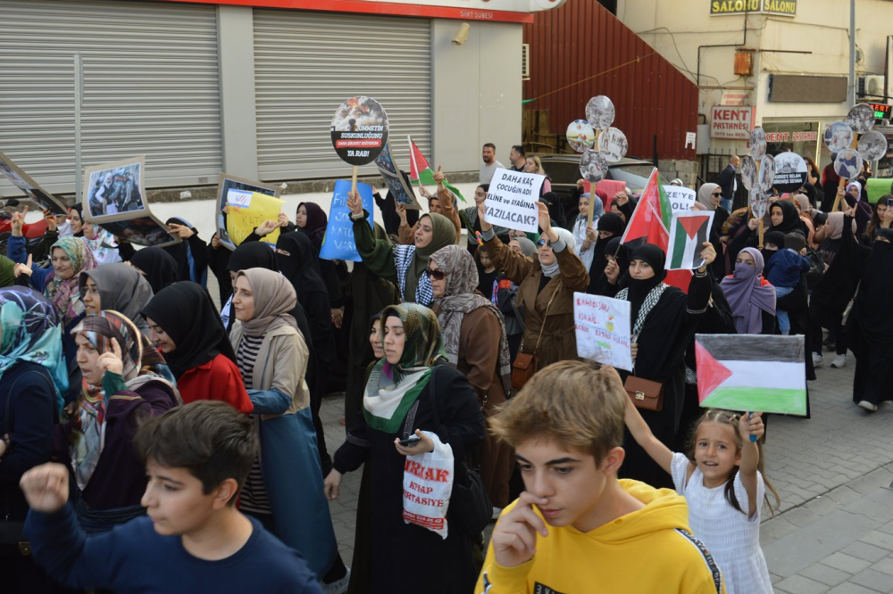 Siyonistleri lanetleyen sloganlar eşliğinde devam eden yürüyüş, Güres caddesi sancaklar ortaokulu "Gazze Yardım Çadırının" önüne kadar sürdü.