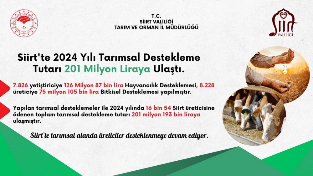 Yapılan tarımsal desteklemeler ile 2024 yılında 16 bin 54 Siirt üreticisine ödenen toplam tarımsal destekleme tutarı 201 milyon 193 bin liraya ulaşmıştır.