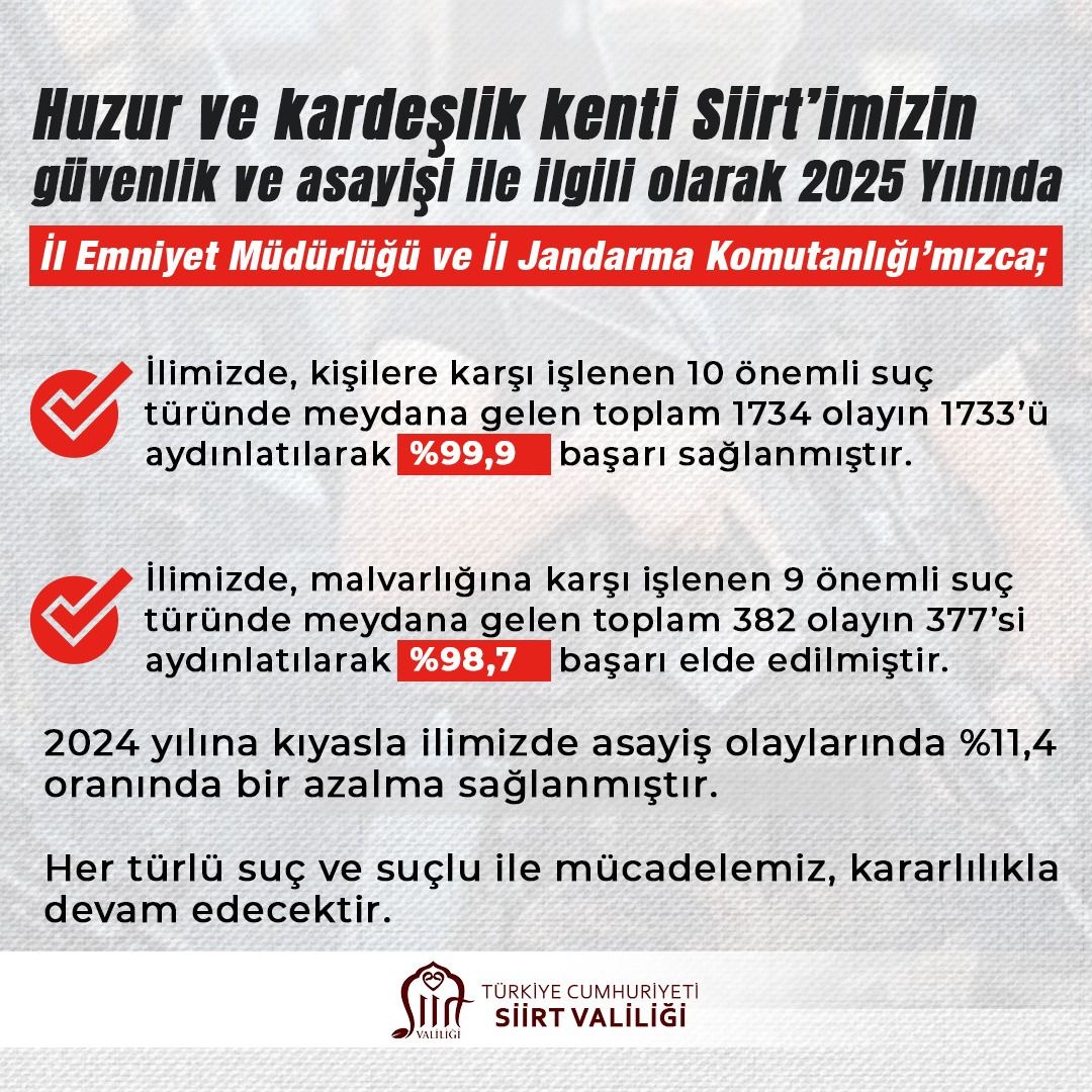 Öte yandan 2024 yılına kıyasla, il genelindeki asayiş olaylarında %11,4 oranında azalma sağlanması, Siirt’in her geçen yıl daha güvenli bir şehir haline geldiğini gösterdi.