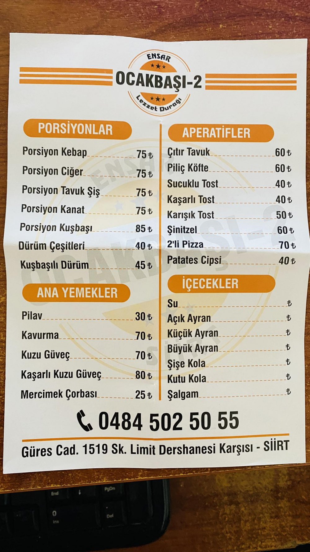 2 katlı restoran, haftanın her günü müşterilerini ağırlayacak olan Ensar Ocakbaşı-2 de ızgara çeşitleri, kebap çeşitleri,Pilav,Kavurma,Kuzu Güveç, Kaşarlı Kuzu Güveç,Sucuklu ve Kaşarlı Tost çeşitleri,Şinitzel,Çıtır Tavuk, 2’li Pizza Çeşitleri ve daha pek çok yöresel yemeği bulabileceksiniz.