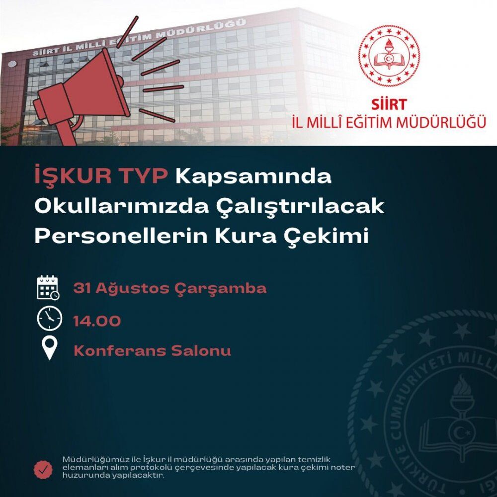 Siirt il merkezi ve Kurtalan, Baykan,Pervari, Şirvan,Eruh be Tillo ilçesinde görevlendirilecek olan 480 personelin bilgisayar kuraları 31 Ağustos 2022 Çarşamba günü saat 14.00 te Milli Eğitim Müdürlüğü Konferans salonunda noter tarafından çekilecek. Ve halka açık internet sitelerinden canlı yayınlanacağı öğrenildi.
