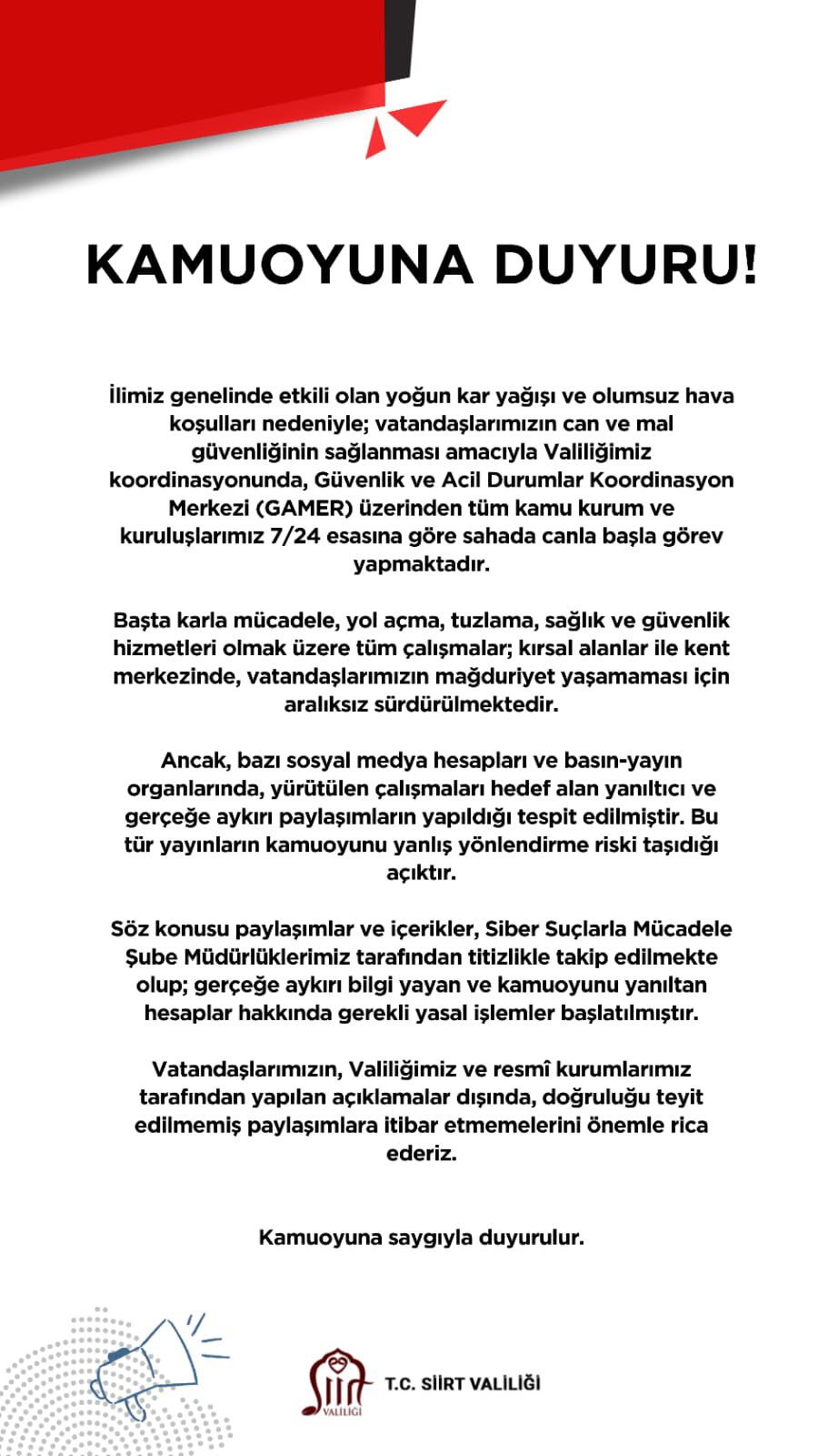Siirt Valiliği, vatandaşlardan yalnızca Valilik ve resmî kurumlar tarafından yapılan açıklamalara itibar etmelerini, doğruluğu teyit edilmemiş paylaşımlara karşı dikkatli olmalarını önemle rica etti.