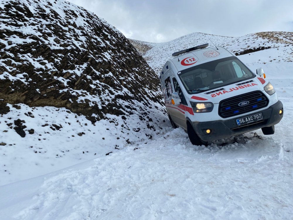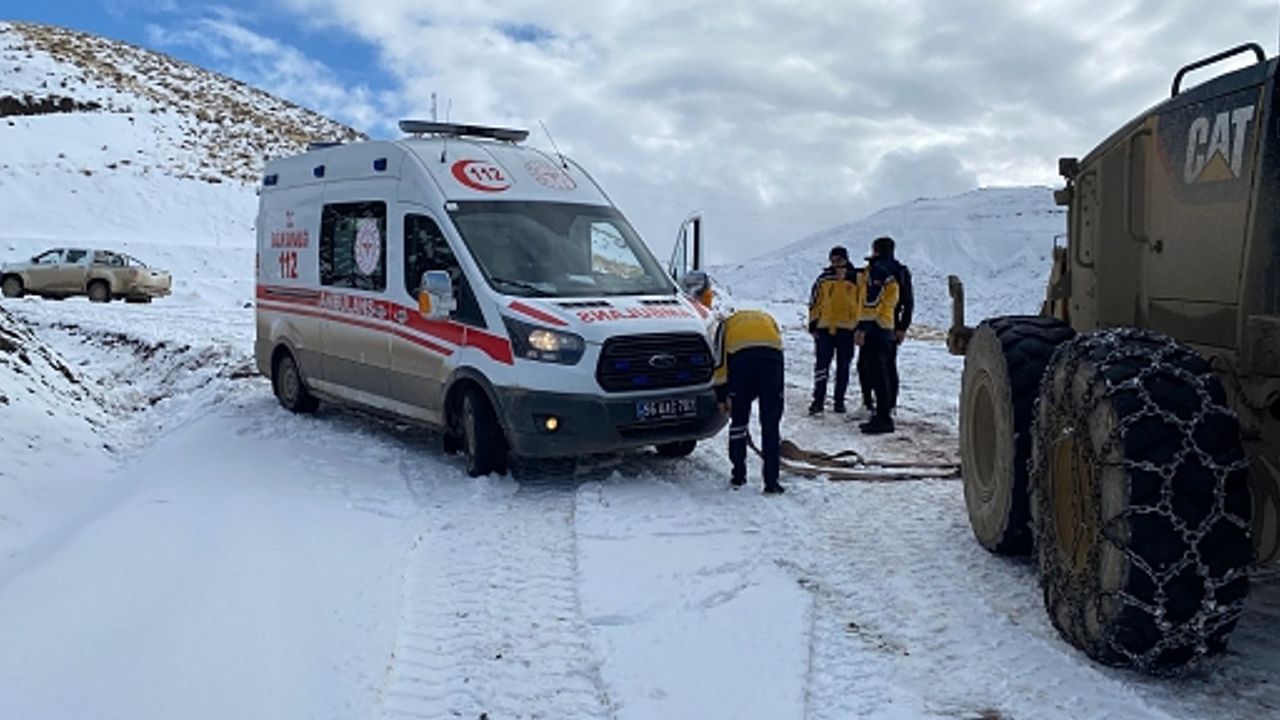 Siirt'in Pervari ilçesinde, yoğun kar yağışı nedeniyle yolda mahsur kalan ambulans, İl Özel İdaresi ekiplerince kurtarıldı.