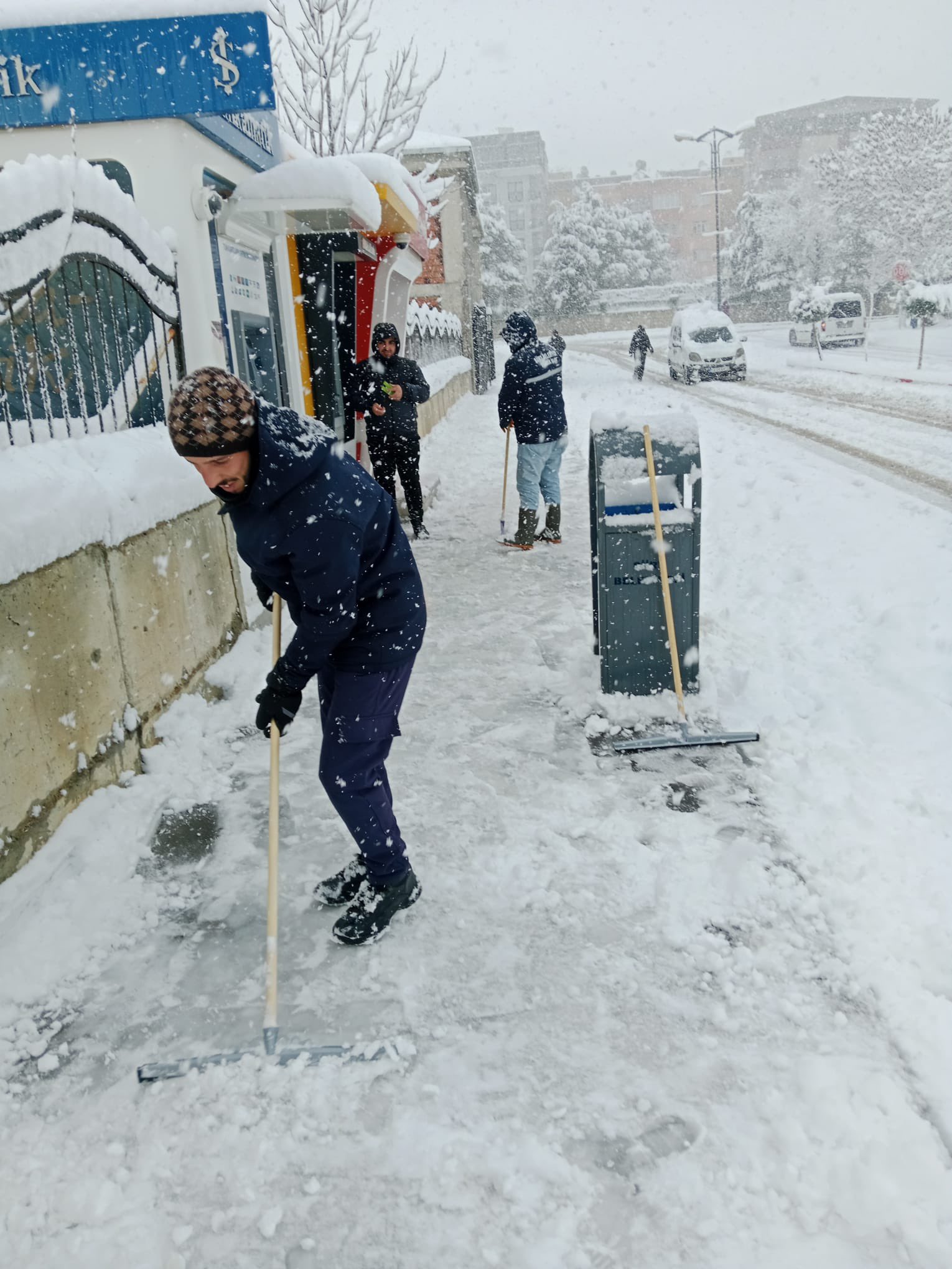 Zorlu hava koşullarına rağmen özveriyle görev yapan belediye personeli, şehir içi trafiğin açık tutulması için çalışmalarını titizlikle sürdürüyor.