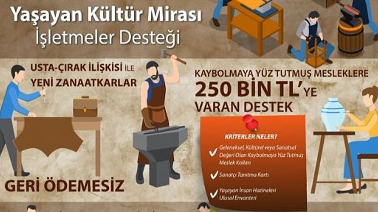 Kaybolmaya yüz tutmuş mesleklere 250 bin TL’ye varan destek verilecek. Geri ödemesiz destekle geleneksel, kültürel ve sanatsal değeri olan mesleklerin gelecek nesillere aktarılması hedefleniyor.
