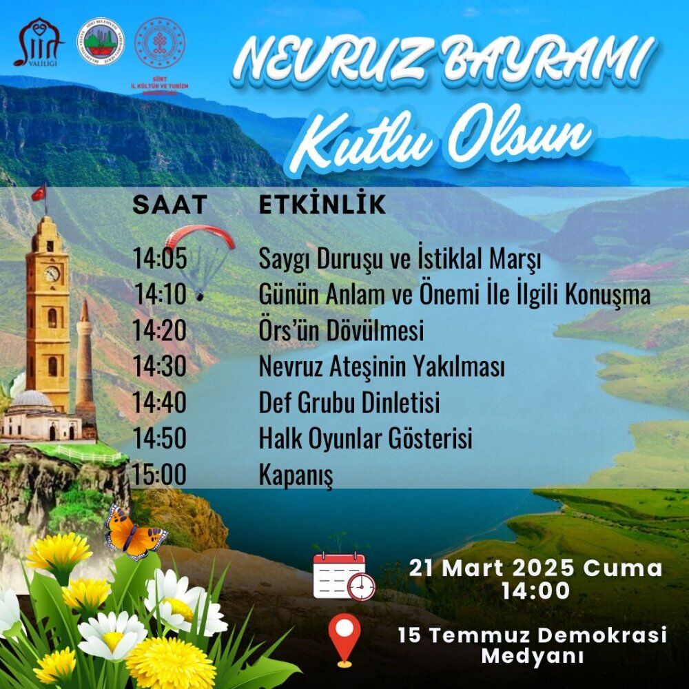 Siirt Valiliği ve İl Kültür ve Turizm Müdürlüğü tarafından organize edilen Nevruz Bayramı etkinlikleri, 21 Mart 2025 Cuma günü 15 Temmuz Demokrasi Meydanı’nda gerçekleştirilecektir.