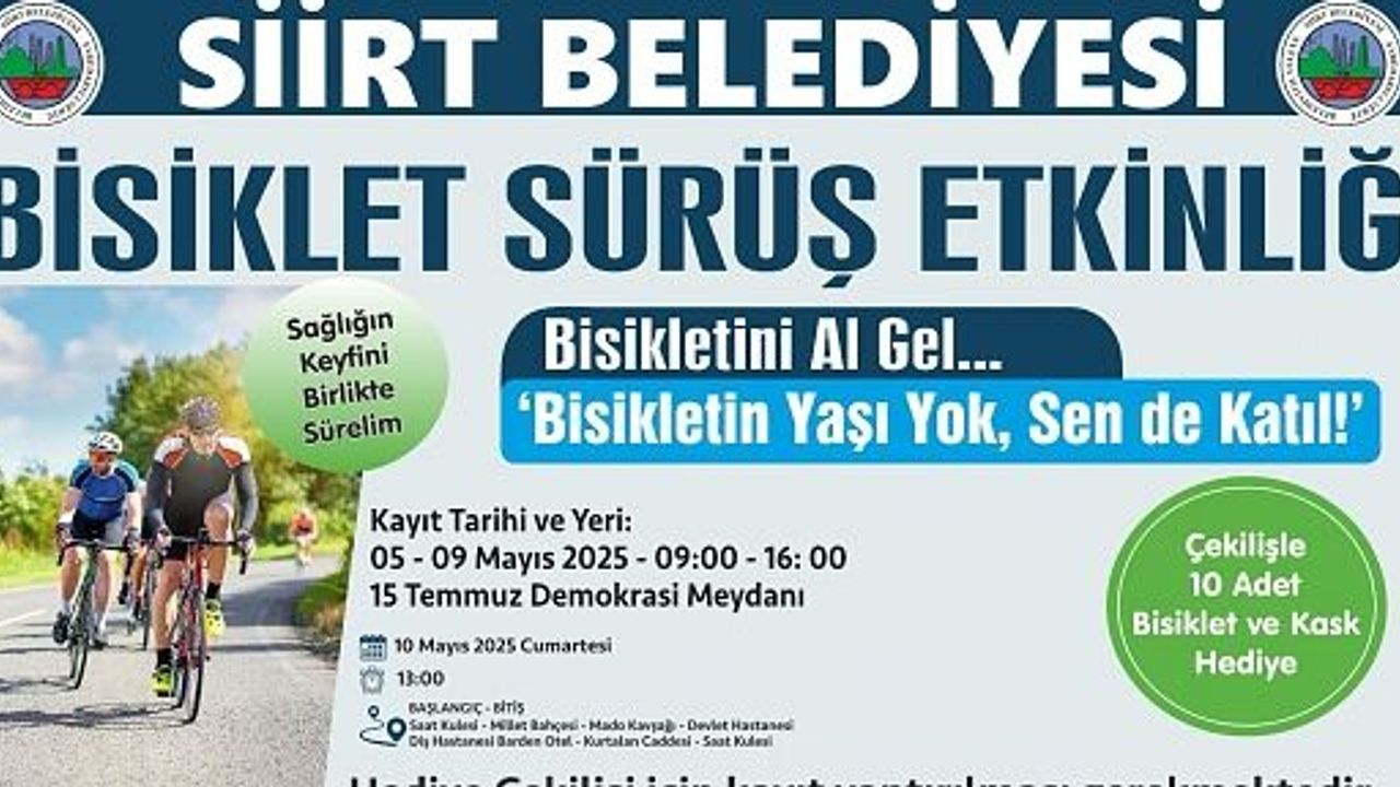 Siirt Belediyesi, sağlıklı yaşamı teşvik etmek ve toplumsal birlikteliği güçlendirmek amacıyla 10 Mayıs 2025 Cumartesi günü “Bisiklet Sürüş Etkinliği” düzenliyor. Etkinlikte hem spor hem de eğlence bir araya gelecek.