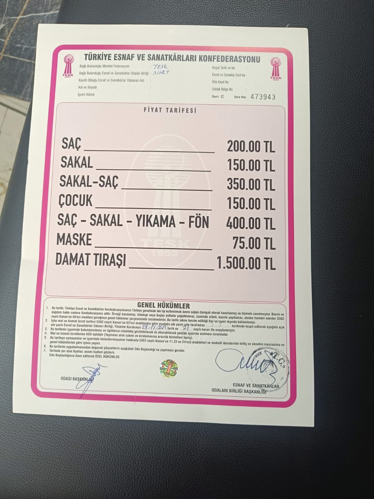 SİİRT’TE YENİ TIRAŞ FİYAT TARİFESİ ŞÖYLE: