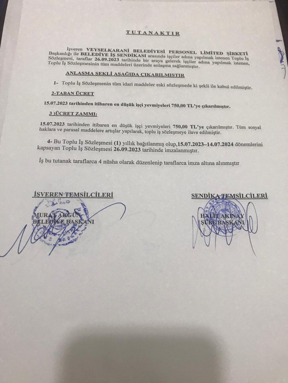 4- Bu Toplu İş Sözleşmesi (1) yıllık bağıtlanmış olup,15.07.2023-14.07.2024 dönemlerini kapsayan Toplu İş Sözleşmesi 26.09.2023 tarihinde imzalanmıştır. İş bu tutanak taraflarca 4 nüsha olarak düzenlenip taraflarca imza altına alınmıştır