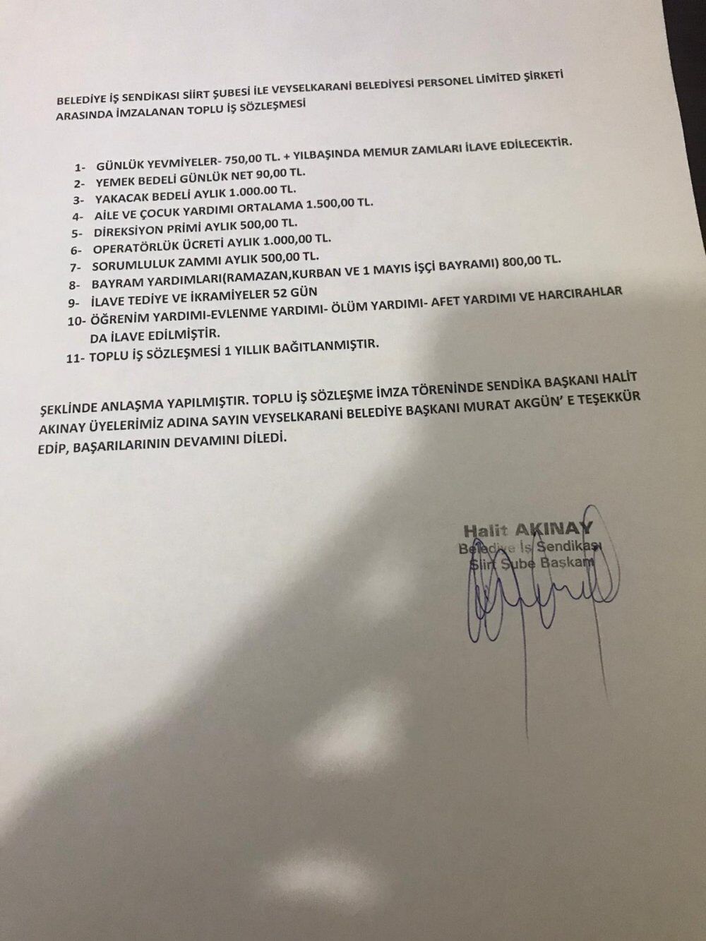 Akınay, sözleşmenin her iki tarafa da hayırlı olması dileğinde bulundu. Veysel Karani Belediye Başkanı Murat Akgün ile Belediye-İş Sendikası Siirt Şube Başkanı Halit Akınay birbirlerini tebrik ederek, protokol metnini imzaladılar.