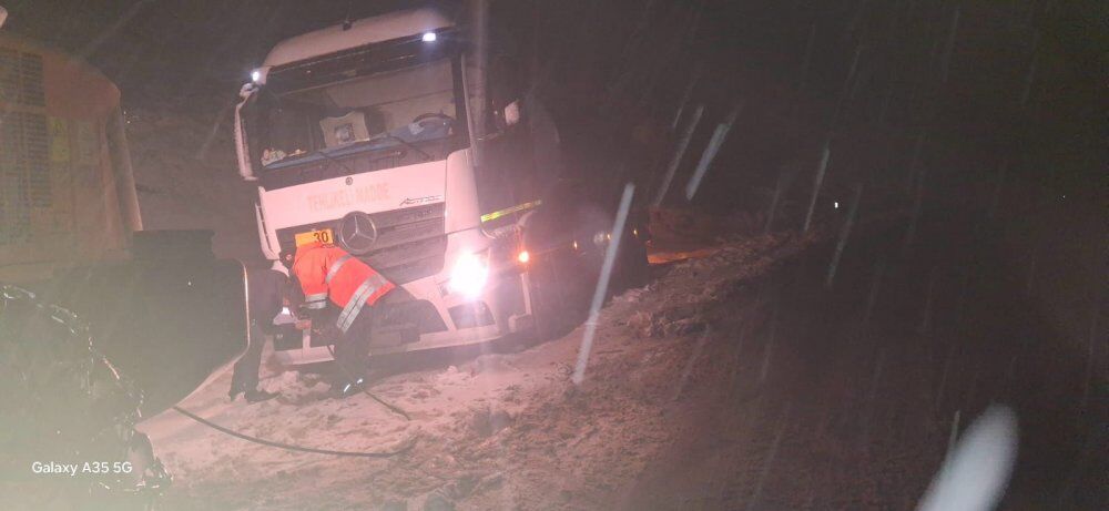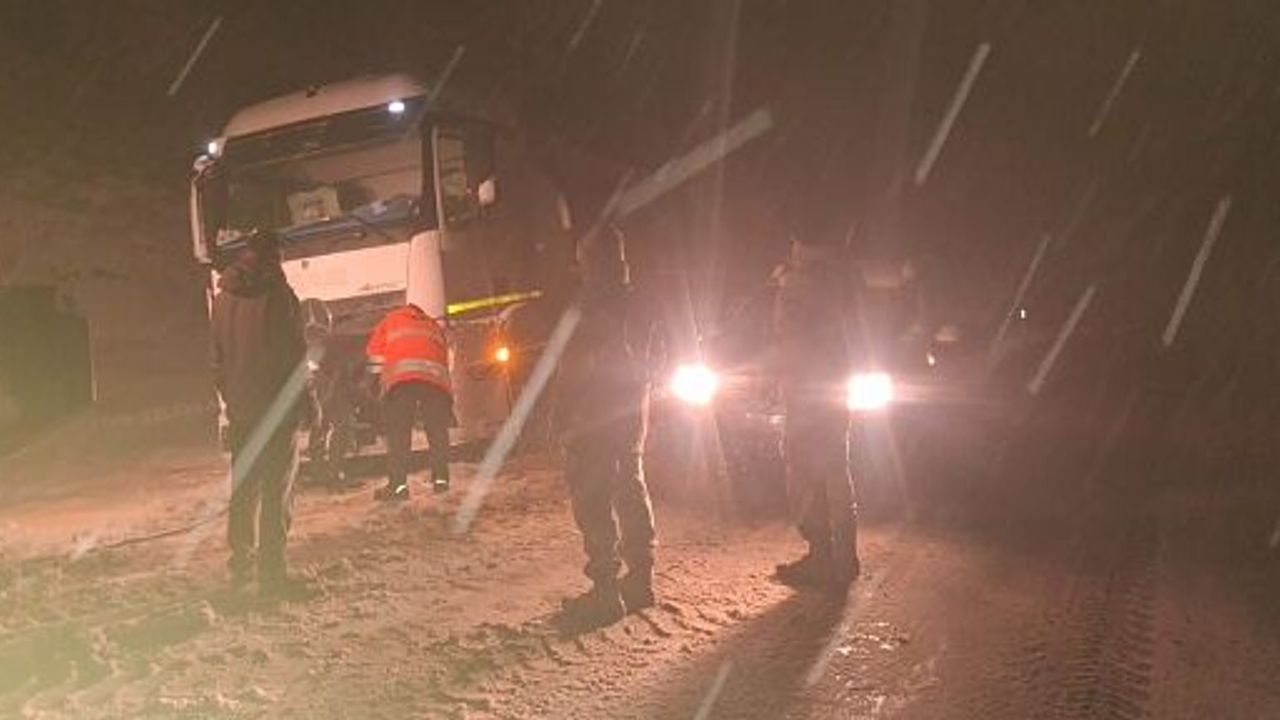 Kar lastiği kullanmayan bir tır, yol dışına çıkarak mahsur kaldı. Karayolları ekiplerinin özverili çalışmaları sayesinde tır kurtarıldı.