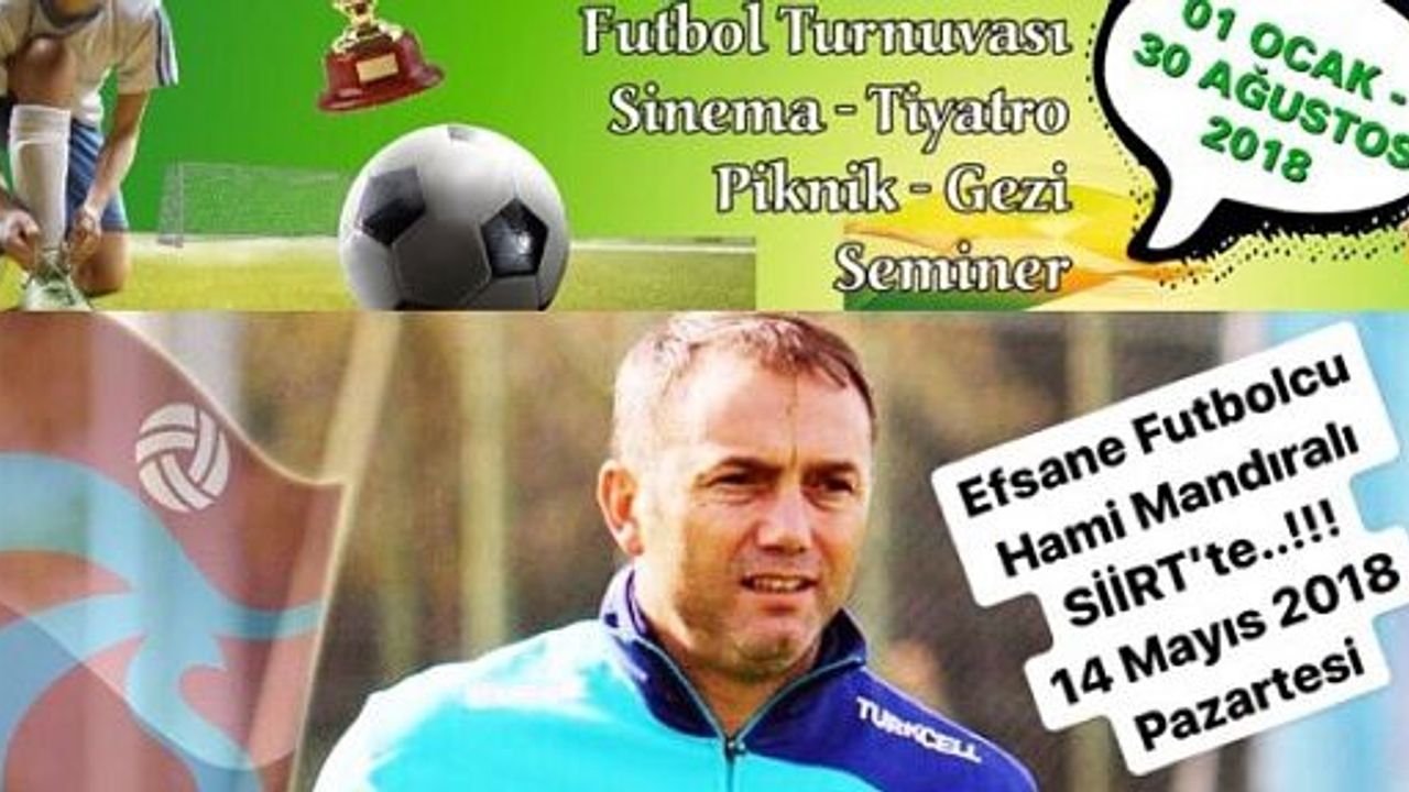 Eski A Mili Takım ve Trabzonspor’un efsane futbolcusu Hami Mandıralı, Siirt Valiliği tarafından düzenlenen 15 Temmuz Demokrasi Şehitleri Halı Saha Turnuvası’nın final maçı için 14 Mayıs 2018 Pazartesi günü ilimize gelecek.