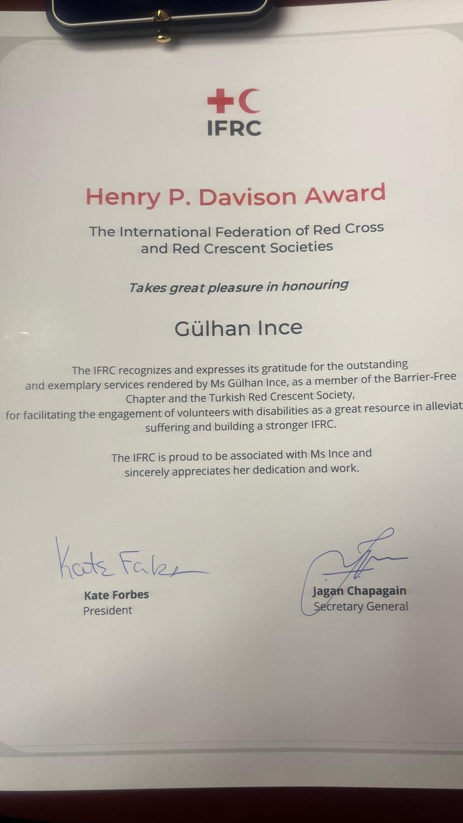Türk Kızılay Engelsiz Birimi, Uluslararası Kızılhaç ve Kızılay Dernekleri Federasyonu (IFRC) tarafındaninsani yardım sektörünün en prestijli ödüllerinden Henry Davison Ödülü’ne layık görüldü.