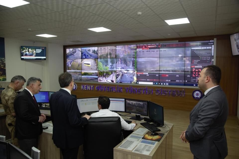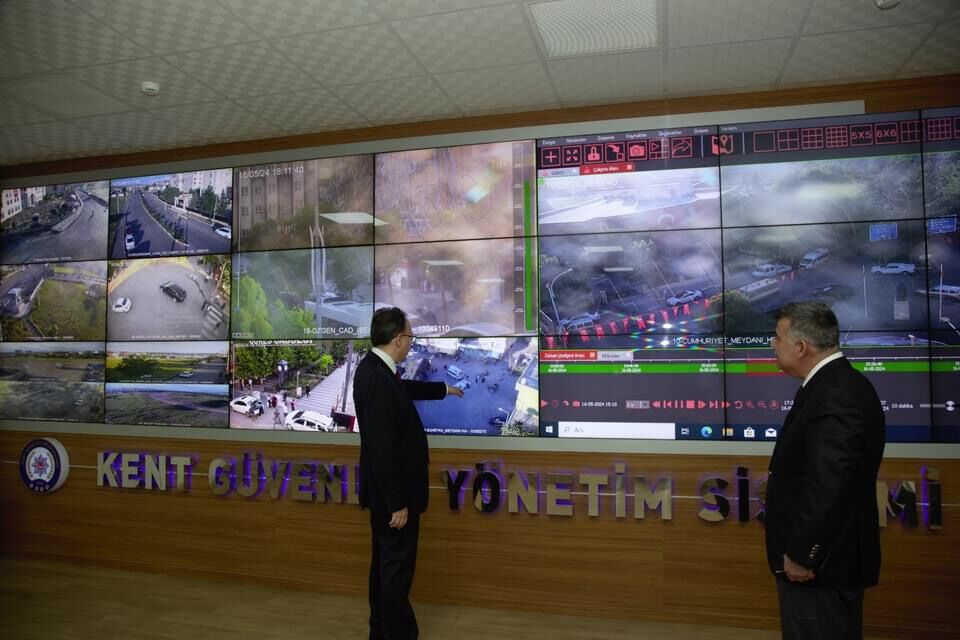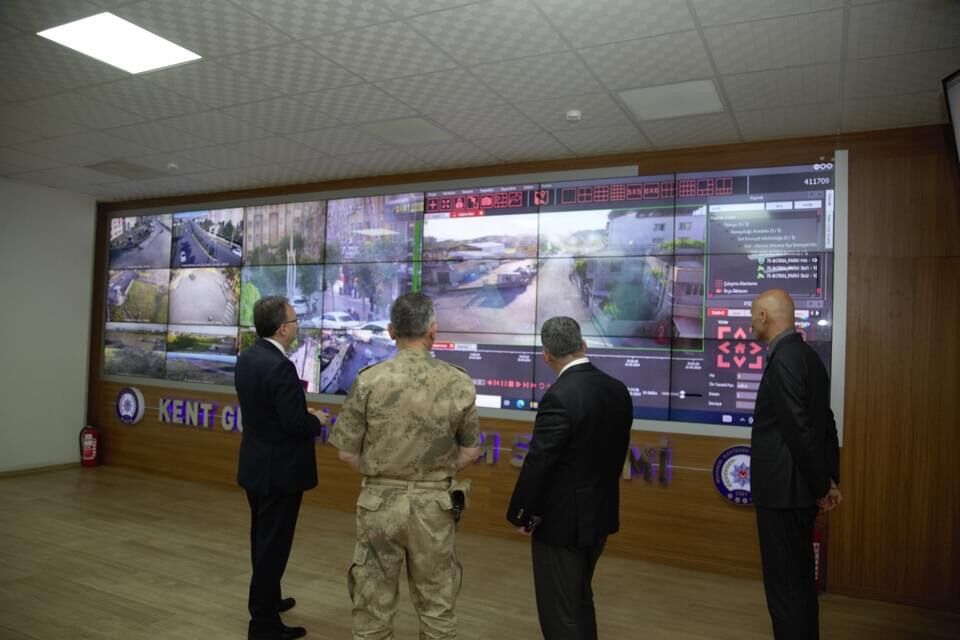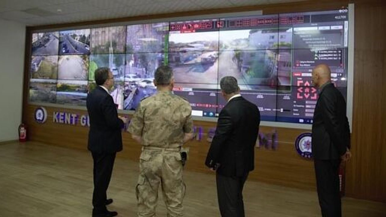 Dev ekranlardan şehri 279 farklı noktadan 800 kamera ile izlendiği güvenlik ve asayiş uygulamalarını yerinde inceleyen Vali Kızılkaya, (KGYS) Merkezi'nde şehrin genel asayiş ve güvenlik çalışmalarını ekranlardan izleyerek, halkımızın huzur ve güvenliği için güvenlik birimlerinin hizmetlerine 7/24 büyük bir kararlılıkla devam ettiğini belitti.